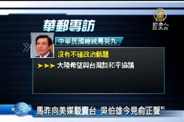 總統馬英九24日接受外媒華盛頓郵報專訪,馬總統駁斥了所謂賣台指控,並說兩岸商談和平協議必須有全民共識。不過,國民黨榮譽主席吳伯雄也接受馬總統請託,將向中共提出「兩岸沒有只經不政」的主張,格外敏感。 //asset1.ntdtv.com.tw/public/uploads/video/2013/10/26/20131026-17931718.mp4 :台灣要聞|馬英九|吳伯雄|和平協議|華盛頓郵報2013-10-25 21:26:26