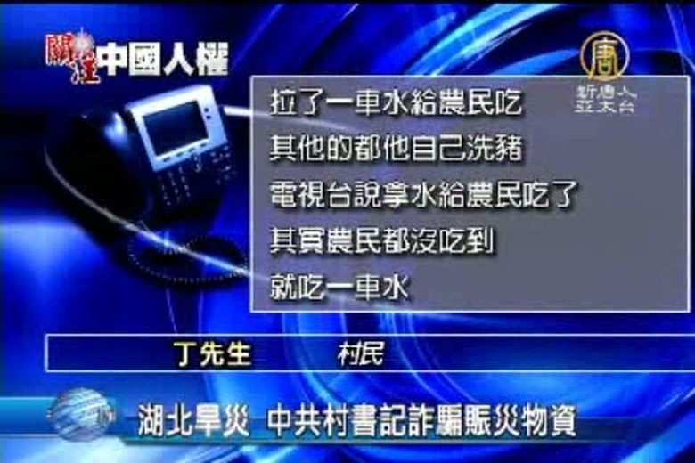 中國湖北咸寧市崇陽縣,今年8月以來持續乾旱,高耀村村書記丁亮新抽乾村裡水塘的水,詐騙賑災物資,救災的水拿來洗自家豬圈,村民只好到外地挑水喝。另外,村民舉報村書記私刻公章貪污,上訪兩三年都沒有結果。 //asset3.ntdtv.com.tw/public/uploads/video/2013/10/28/20131028-17963169.mp4 真相中國|湖北|農民|貪汙|中共2013-10-27 21:04:24