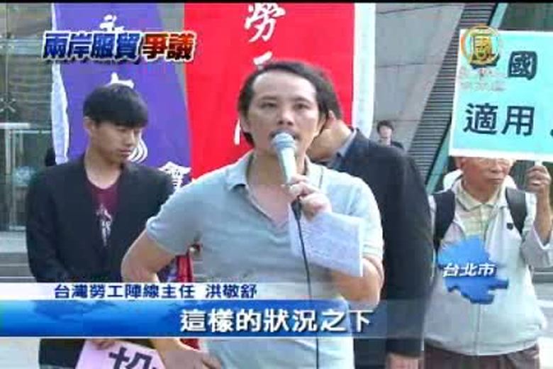 總統希望服貿協議快快通過,恐怕真的沒那麼簡單。今天(29日)多個民間團體在中國銀行台北分行前,抗議政府違背承諾,開放中國大陸勞工。民間團體指出,中國勞工早就以各類專業、商務名義來台就業。因此呼籲政府,應當將中國勞工比照外籍勞工,明訂來台人數上限與最低薪資,避免衝擊本國就業市場。 //asset3.ntdtv.com.tw/public/uploads/video/2013/10/30/20131030-17990694.mp4 台灣要聞|兩岸|服貿|中國勞工|中國銀行2013-10-29 21:26:03