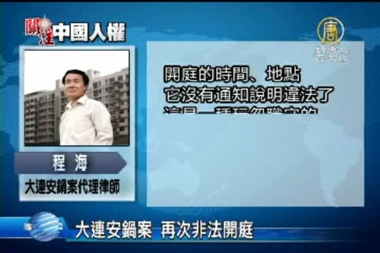 遼寧大連11名法輪功學員,因為安裝收看海外《新唐人》電視節目的衛星接收器,俗稱「安鍋」,被中共當局入罪,今天大連市中山區法院在沒有通知辯護律師的情況下,再次非法開庭。 //asset2.ntdtv.com.tw/public/uploads/video/2013/10/30/20131030-17990705.mp4 真相中國|法輪功|新唐人|安鍋|非法開庭|遼寧2013-10-29 21:06:32