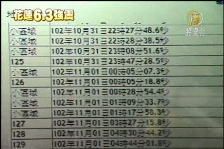 昨晚8點02分花蓮發生規模6.3,今年第二大的強烈地震,之後又陸陸續續出現許多餘震,最大是規模4.8,發生在昨晚11點47分,地震中心提醒,未來兩週還會出現規模5以上的餘震。 //asset1.ntdtv.com.tw/public/uploads/video/2013/11/02/20131102-18046231.mp4 台灣要聞|花蓮|6.3|地震|餘震|地震中心2013-11-01 21:05:28