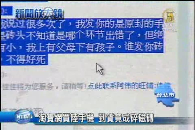 立委警告中資進入台灣電信與網站的問題,事實上新北市一名沈姓民眾,上個月(10月)在大陸購物網站淘寶網,買了最新款的大陸小米機手機,價值將近台幣一萬三千元,但等了 11天打開紙盒,竟然倒出5片破碎的磁磚,他向賣家和淘寶網反應,換來的答案是一切正常沒問題,賣家態度惡劣,讓沈先生求償無門。 //asset3.ntdtv.com.tw/public/uploads/video/2013/11/08/20131108-18142530.mp4 消費流行|淘寶網|小米機|磁磚|求償無門2013-11-07 21:04:39