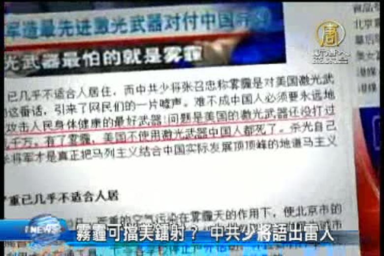 霧霾再度席捲中國,受影響的人口高達6億人。但就在民怨焦慮沸騰之際,中共解放軍少將張召忠爆出驚人之語,稱「霧霾是對美國鐳射武器的最好防禦」,引發網友各式吐槽和炮轟。 //asset3.ntdtv.com.tw/public/uploads/video/2014/02/26/20140226-19884830.mp4 真相中國|霧霾|空氣質量|污染|紅色預警|張召忠2014-02-25 21:16:31
