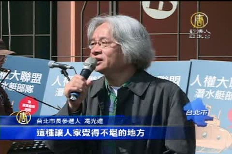 有意參選台北市長的作家馮光遠,今天(25日)在連勝文宣佈參選的建成圓環外,與另一位參選人顧立雄,召開記者會,成立人權大聯盟;共同出席的還有十多位律師,準備與連勝文的航空母艦律師團抗衡,在未來選戰中,替不幸被告的候選人,免費打官司。 //asset2.ntdtv.com.tw/public/uploads/video/2014/02/26/20140226-19884854.mp4 台灣要聞|馮光遠|台北市長|顧立雄|連勝文|圓環2014-02-26 14:39:57