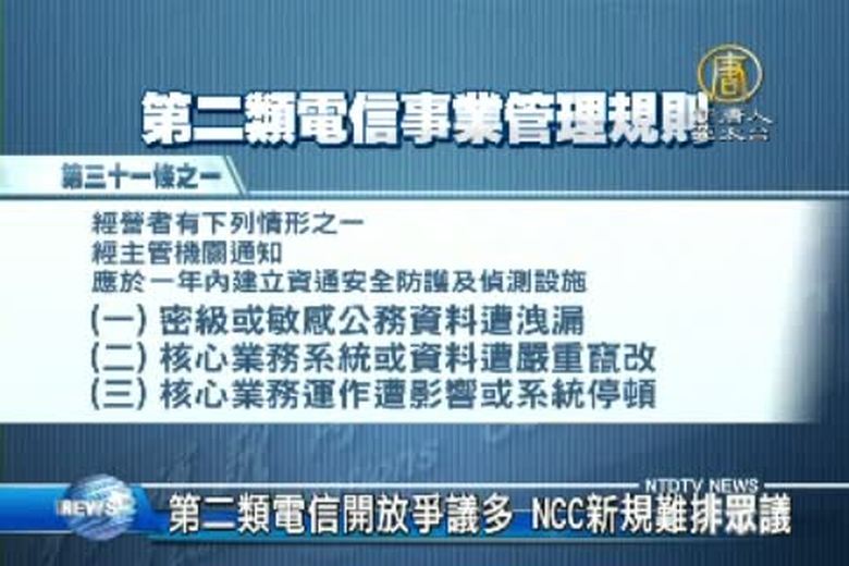 太陽花學運過後,600多位學者聯署反對,服貿開放資通訊產業,而且持續增加中,現在主管機關NCC決定,修訂《第二類電信事業管理規則》,將2009年的資通安全作業要點法制化。 //asset3.ntdtv.com.tw/public/uploads/video/2014/06/18/20140618-23977191.mp4 台灣要聞|NCC|資通業|第二類電信事業管理規則2014-06-17 21:05:32