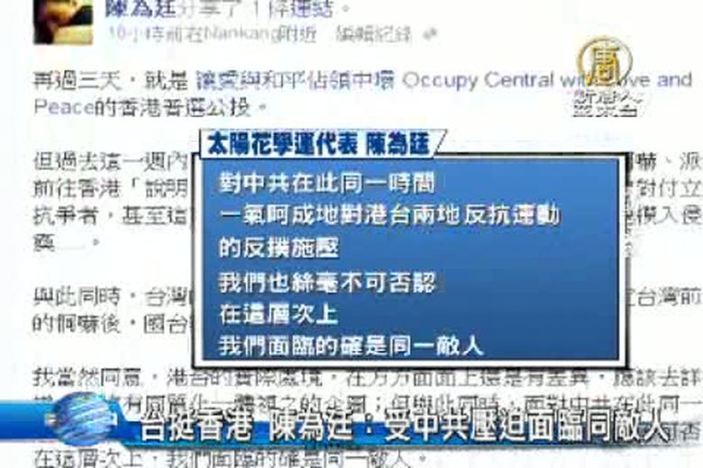 禮拜天,香港就要舉行622公投爭普選,即使中共以白皮書威脅,關注聲浪還是越來越高,尤其是台灣的公民團體,台灣太陽花學運代表陳為廷在臉書上表示,中共企圖壓制台港公民力量的反撲,香港與台灣正面臨同一個敵人。 //asset2.ntdtv.com.tw/public/uploads/video/2014/06/18/20140618-23977208.mp4 台灣要聞|香港|公投|太陽花|陳為廷2014-06-17 21:28:16