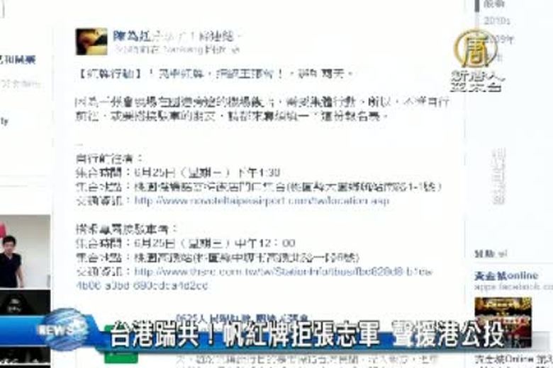 距中共國台辦主任張志軍來台只剩兩天,島國前進陳為廷、林飛帆發起的人民舉紅牌,拒絕王張會行動,持續在臉書上更新動態,號召民眾加入,關注台灣,也沒忘記香港,林飛帆就錄了一段影片,聲援港人公投。 //asset3.ntdtv.com.tw/public/uploads/video/2014/06/24/20140624-24205750.mp4 台灣要聞|王張會|陳為廷|林飛帆|622佔中公投2014-06-23 21:17:28