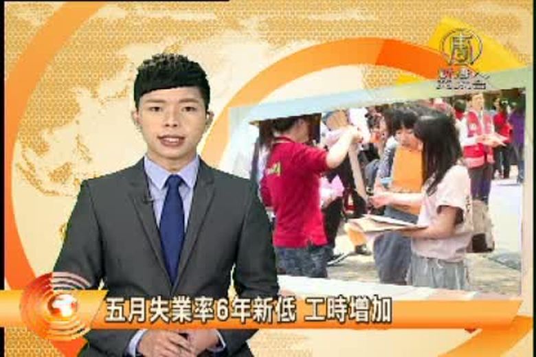 來看到財經消息,行政院主計總處今天公布5月份失業率為3.85%,比4月份減少了6千人,創下近6年來失業率最低紀錄。在薪資方面,4月平均薪資是新台幣5萬3千7百多元,是歷年同期最高。 //asset3.ntdtv.com.tw/public/uploads/video/2014/06/24/20140624-24205755.mp4 台灣要聞|月均薪|主計處失業率2014-06-23 21:10:43