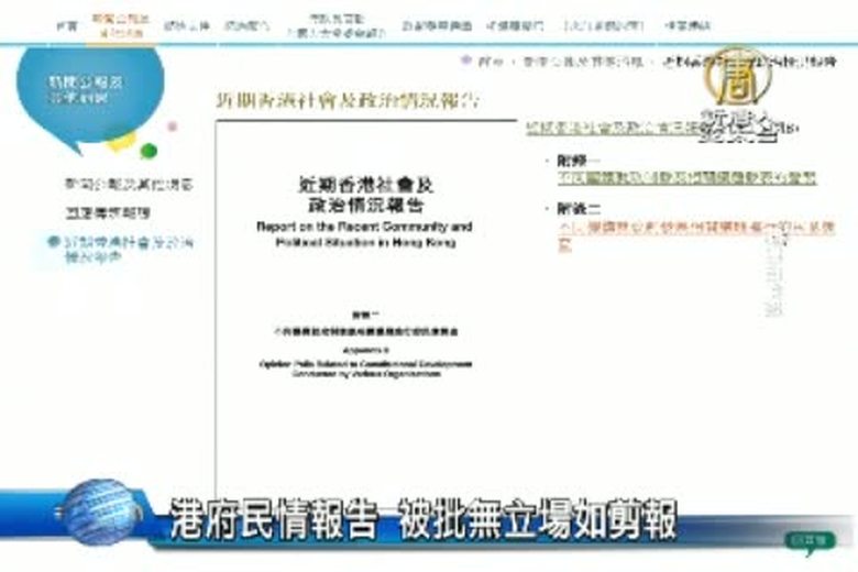 香港傳真來看到,港府今天(6日)向中共國務院港澳辦提交「民情報告」,並上傳港府網站,供公眾參閱,報告連同附件超過1千頁,當中羅列了去年8.31到12.15佔領運動期間的相關民調等資料。不過,學民思潮召集人黃之鋒在臉書貼文,批評民情報告沒有分析及表達政府立場,在結語部分扭曲民意,令人失望。網友也回應,這只是一份黨媒剪報。 //asset2.ntdtv.com.tw/public/uploads/video/2015/01/07/20150107-32394665.mp4 真相中國|民情報告|香港|佔中|黃之鋒|港府2015-01-06 21:23:03