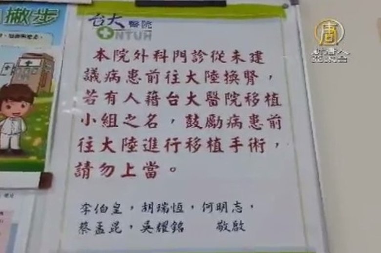 國際譴責中共活摘良心犯與法輪功學員器官罪行,臺大醫院也貼出告示,強調醫院從未建議病患前往大陸換腎,如果有人假借台大之名仲介到中國移植旅遊,請病患小心,不要上當。 //asset1.ntdtv.com.tw/public/uploads/video/2015/01/10/20150110-32556708.mp4 台灣要聞|中國|器官|移植|仲介|台大|最新消息2015-01-09 21:21:50