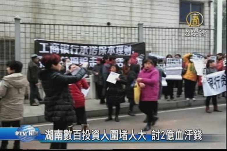 中國新聞方面,湖南省長沙市數百名投資人9日圍堵在湖南省人大門前,靜坐抗議湖南省工商銀行和中國銀行騙售約2億元信託理財產品,拉起橫幅討要血汗錢。抗議民眾說,他們在湖南省工商銀行和中國銀行購買了湖南博灃資產管理有限公司的信託產品,結果博灃公司老闆捲款逃跑,讓他們面臨血本無歸的困境。中共官方出動大批警察到現場用武力驅趕民眾,造成2人受傷,並有2人被抓捕。 //asset2.ntdtv.com.tw/public/uploads/video/2015/01/12/20150112-32606246.mp4 台灣要聞|湖南|長沙市|人大|抗議2015-01-11 23:38:56