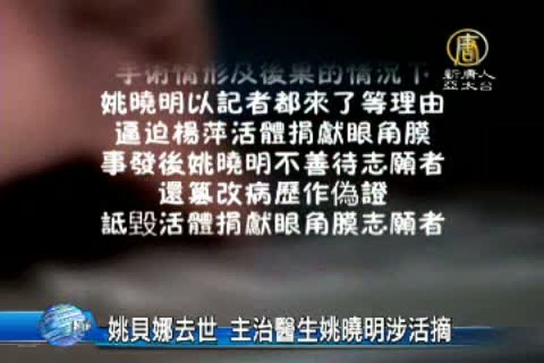 中國歌手姚貝娜乳腺癌復發去世後,有陸媒記者喬裝成醫生助手偷拍遺體,引發抨擊。另外,主治醫生姚曉明也被揭露,涉嫌活體摘除民眾角膜,包括大量的法輪功學員。 //asset1.ntdtv.com.tw/public/uploads/video/2015/01/21/20150121-32966925.mp4 真相中國|姚貝娜|主治醫生|姚曉明|活摘器官|器官移植2015-01-20 21:25:09