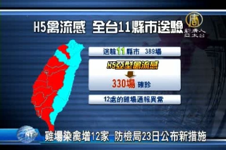 關心禽流感疫情的最新情況,農委會防檢局今天(22日)公布,目前已有11個縣市送檢389場,確診H5亞型禽流感高達330場。另外又多出12處的雞場通報異常,當中花蓮縣也通報1處雞場有異常情況,還好經過初步檢驗,還沒有驗出禽流感病毒,讓疫情暫時維持在台灣西部,沒有蔓延至東部,但雞隻感染情況明顯加劇,防檢局表示,明天將公布新的防疫措施。 //asset2.ntdtv.com.tw/public/uploads/video/2015/01/23/20150123-33083621.mp4 台灣要聞|禽流感|雞|死亡|花蓮|東部|防檢局2015-01-22 21:18:20