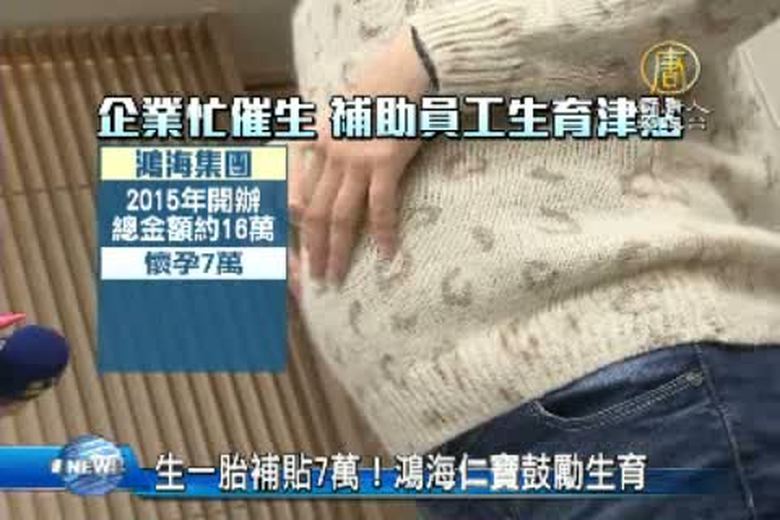 台灣面臨少子化危機,2014年總生育率 全球最後一名,為了鼓勵員工生育,企業也幫忙「催生」,鴻海集團28日宣布,員工生育每胎至少補助7萬,仁寶集團也早在4年前,就有6萬6的補助,讓女性員工,想要再生一個。 //asset3.ntdtv.com.tw/public/uploads/video/2015/01/30/20150130-33398221.mp4 經濟焦點|鴻海|郭台銘|仁寶|許勝雄|生育補助|生孩子2015-01-29 21:50:07