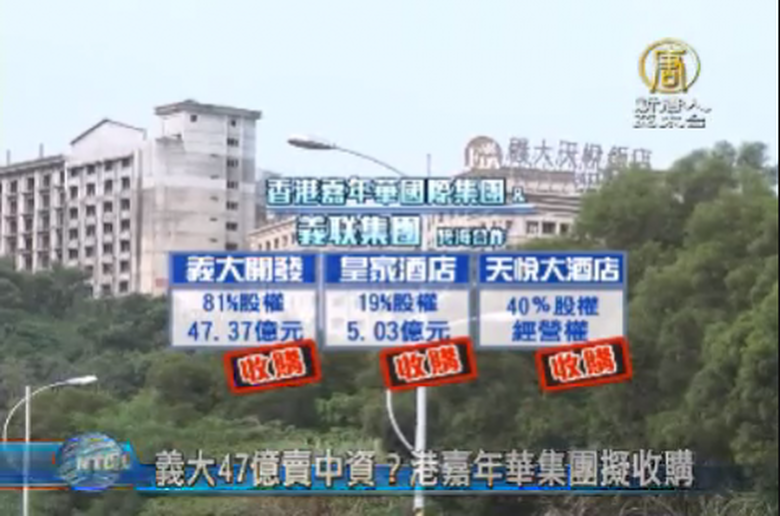 高雄義大遊樂園要賣給港資了,去年8月,義聯集團的聯眾不鏽鋼廠售給中國鞍鋼後,義聯集團昨天(29日)也證實,旗下義大開發及酒店,將售給港商嘉年華國際,出脫股權最高達8成,約新台幣47億元,不過有學者擔心,港商嘉年華國際背景有中資色彩,雙方合作,引發疑慮。 //asset1.ntdtv.com.tw/public/uploads/video/2015/01/31/20150131-33460140.mp4 經濟焦點|義聯集團|義大|嘉年華國際集團|中共因素|紅色|最新消息2015-01-30 21:30:58