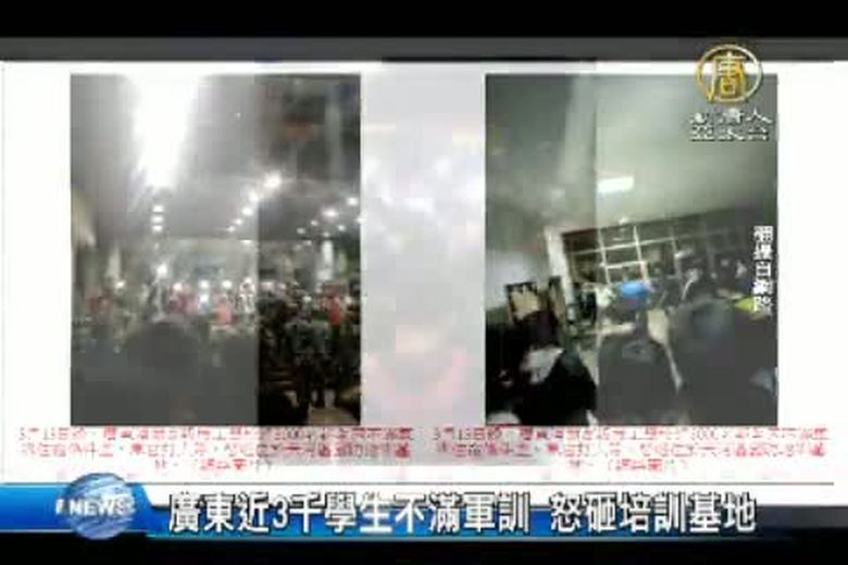 大陸廣東清遠高級技工學校,13日發生將近3千名新生因為不滿軍訓住宿的條件差、教官打人等,怒砸位於天河區國防培訓基地,學校食堂、操場以及教官辦公樓的大量設施被砸毀。14日,學生繼續到操場靜坐要求退700元軍訓費用。最後有300多名學生被退學回家。 //asset1.ntdtv.com.tw/public/uploads/assets/2015/03/15/2015-03-15-550579bc18d81.mp4 真相中國|廣東|軍訓|清遠高級技工學|砸毀2015-03-15 20:17:59