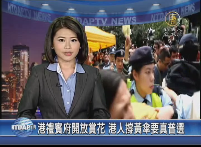 港禮賓府開放賞花 港人撐黃傘要真普選