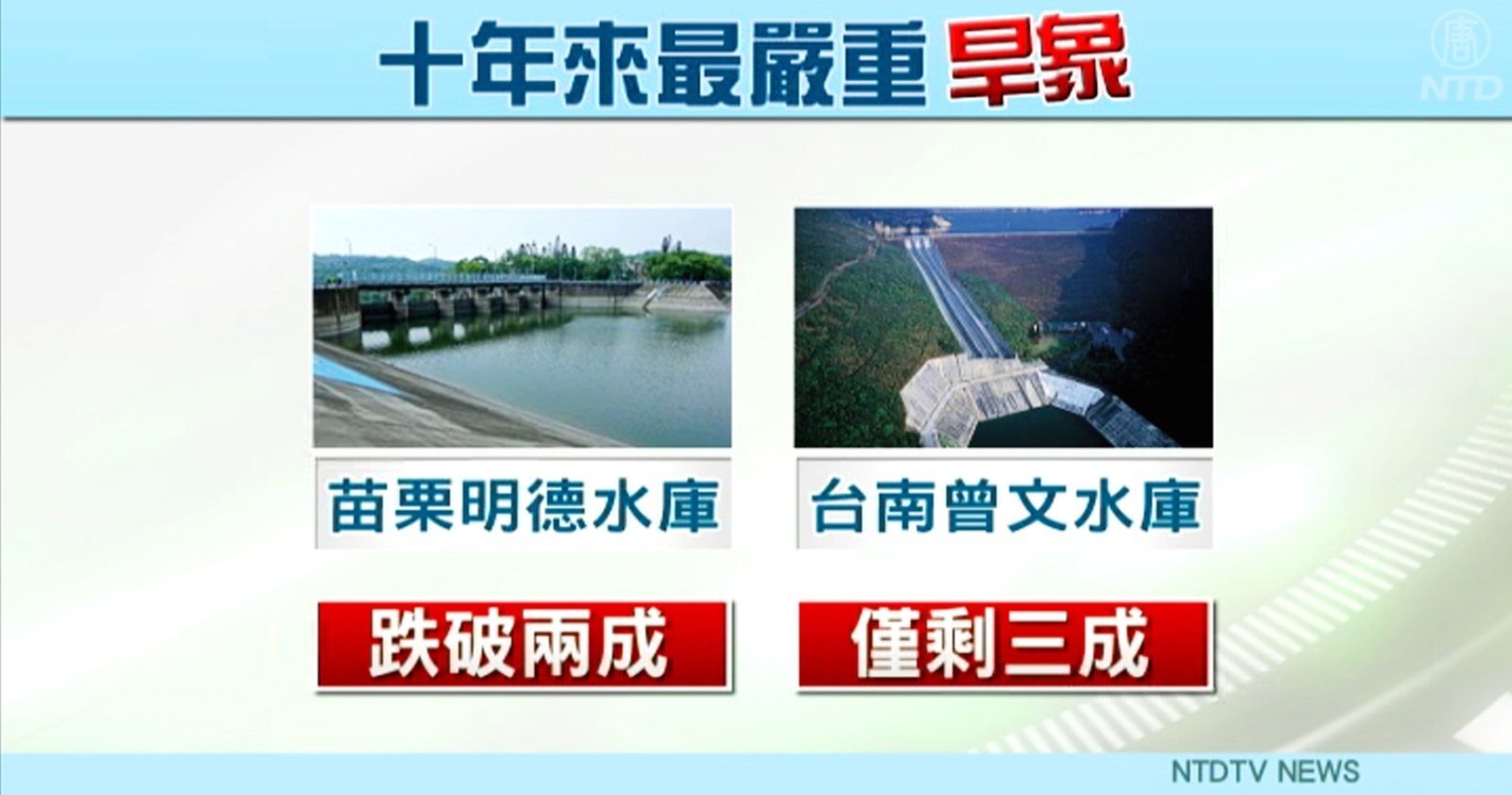 新聞一開始,帶您關心,台灣面臨十年來最嚴重的旱象,部分水庫的蓄水量都降到四分之一以下,水利署今天表示,如果梅雨季遲來,可能會祭出第三階段限水,也就是限制民生用水。 //asset2.ntdtv.com.tw/public/uploads/assets/2015/03/16/2015-03-16-5506e8bf86252.mp4 台灣要聞|限水|乾旱|經濟部|梅雨|節水2015-03-16 20:02:43