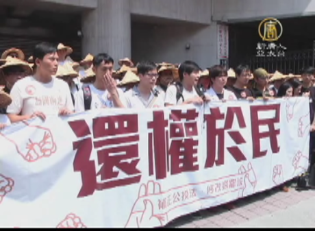 那麼其實從今天白天的時候,立法院周邊就已經相當熱鬧。由林義雄擔任榮譽召集人的「410還權於民行動」,選在太陽花學運一周年的日子,重返立法院,要求立法院下修《公投法》及《選罷法》門檻。包括島國前進,割闌尾計畫,1985等幾百位民眾,不發一語的繞了立院七圈,許久未露面的陳為廷,也現身隊伍當中。 //asset1.ntdtv.com.tw/public/uploads/assets/2015/03/18/2015-03-18-55098b98644e6.mp4 台灣要聞|太陽花|318周年|林義雄|陳為廷|黃國昌2015-03-18 20:05:01