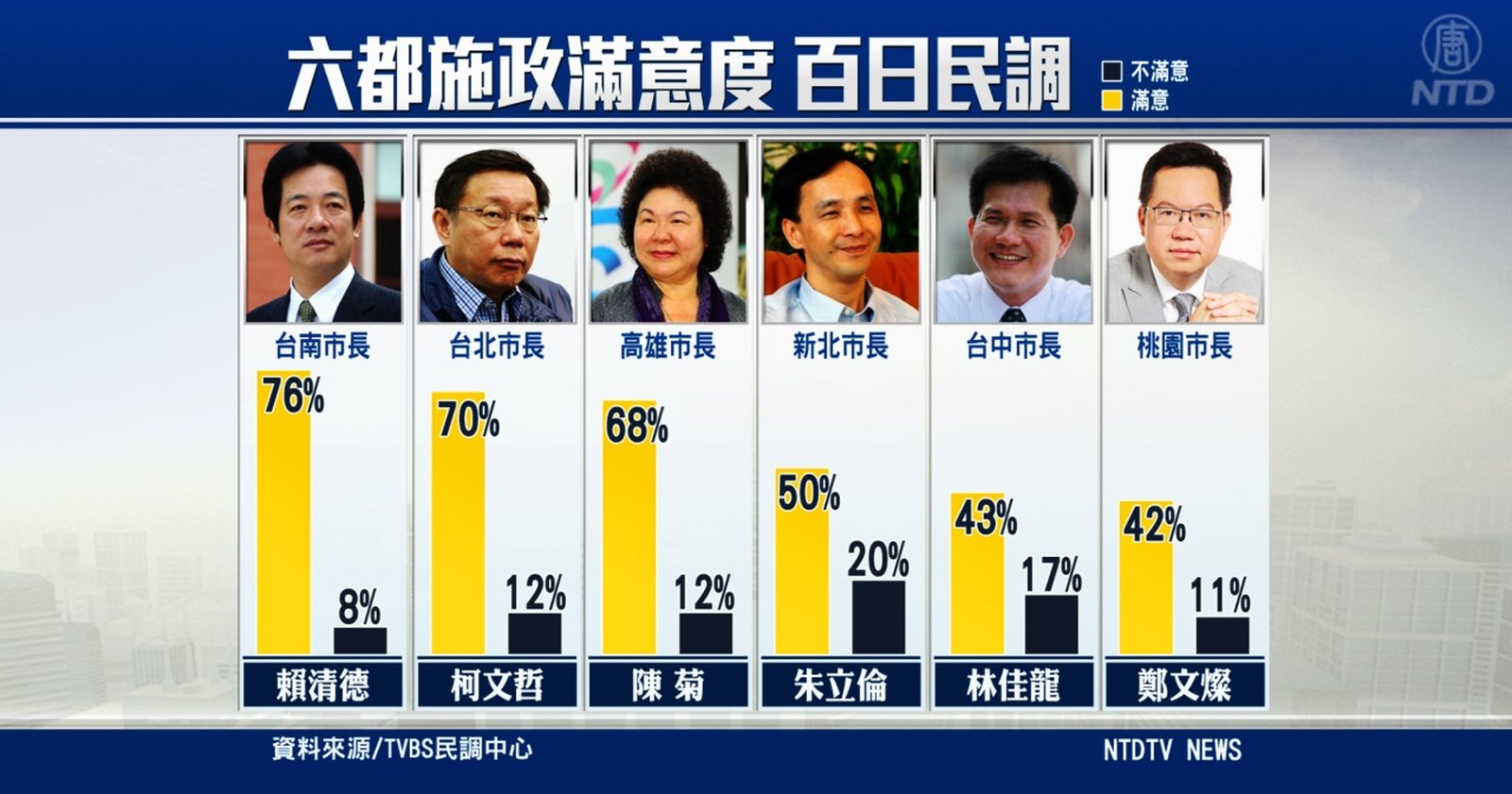 好,接下來我們帶您看到,六都首長就職百日的滿意度,根據另一份電子媒體調查顯示,新北市長朱立倫的施政不滿意度達20%,是六都當中最高,一般認為,這可能與兼任黨主席有關。而台南市長賴清德的施政滿意度,則是位居榜首,比第2名的台北市長柯文哲,多大約6%,而花媽,高雄市長陳菊68%,排名第三。另外,值得觀察的是,台南市府團隊表現有69%的滿意度,其次是高雄市府團隊63%、北市府團隊61%;賴清德及柯文哲個人滿意度,都明顯比團隊的表現,還要高,這顯示:柯文哲賴清德兩人的個人魅力,高於團隊表現。 //asset1.ntdtv.com.tw/public/uploads/assets/2015/03/31/2015-03-31-551a8fb660152.mp4 施政百日|滿意度|賴清德|柯文哲|六都首長2015-03-31 20:08:10