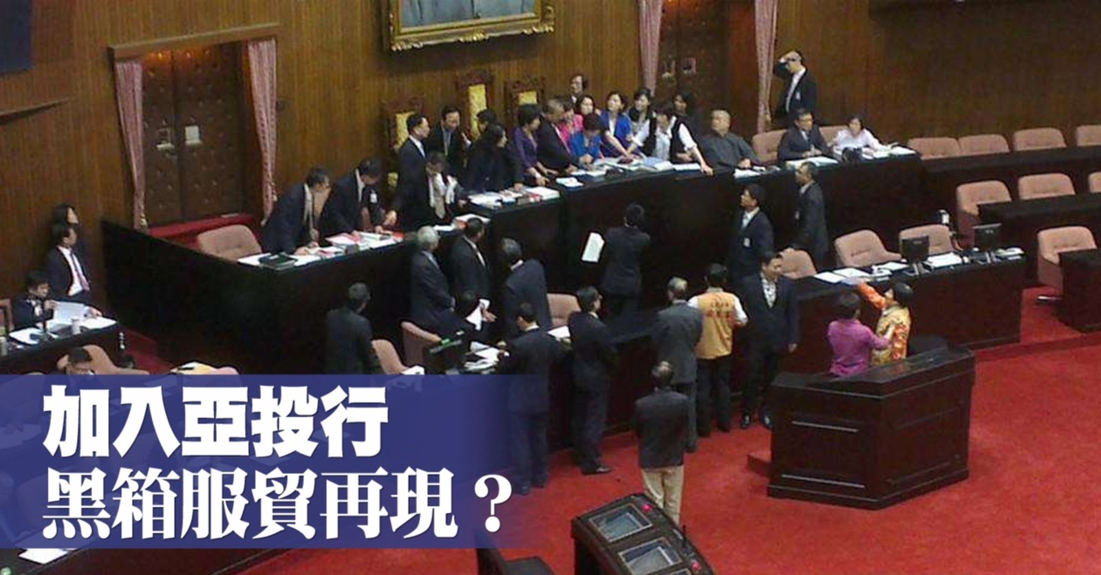 接著看到,總統馬英九昨天召開會議,拍板透過陸委會向國台辦委託遞交亞投行入會意向書,引發爭議。台聯立委上午發動杯葛院會,引爆朝野立委推擠。在野立委質疑,加入亞投行,根本就像是黑箱服貿的翻版,要求行政團隊說清楚講明白。 //asset2.ntdtv.com.tw/public/uploads/assets/2015/03/31/2015-03-31-551a8e9b08f9a.mp4 亞投行|黑箱|馬英九|民進黨|台北2015-03-31 20:04:01