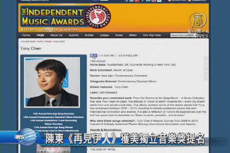 為新唐人紀錄片《自由中國》,創作音樂的華人作曲家陳東,近日以一曲《再見伊人》,獲得第14屆美國獨立音樂大獎賽最佳新世紀音樂單曲提名。他和其他四位音樂人,從四百多名出色的藝術家中脫穎而出,得到評委的青睞。 //asset2.ntdtv.com.tw/public/uploads/assets/2015/04/01/2015-04-01-551c050d0eff4.mp4 娛樂星球|陳東|再見伊人|美國|獨立音樂獎2015-04-01 20:36:25
