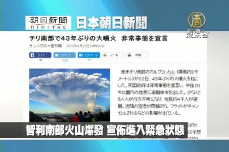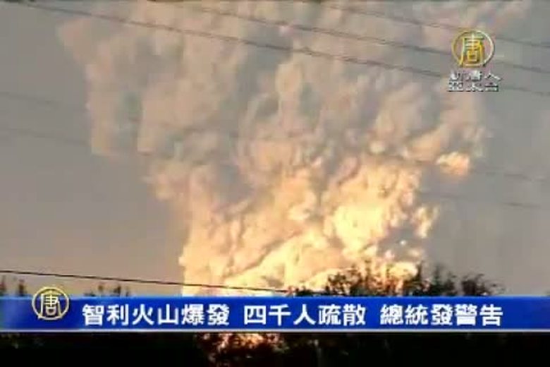 智利南部卡爾布科火山沉寂半世紀以來兩度噴發,噴發的威力驚人,火山熔岩、煙塵直衝天際,伴隨閃電的景象,讓智利當局發布緊急狀態、疏散5000多人,大量的火山灰也覆蓋了鄰近地區,讓當地城鎮看起來宛如死城。 //asset3.ntdtv.com.tw/public/uploads/assets/2015/04/24/2015-04-24-553a513477453.mp4 智利|火山|蘑菇雲|疏散2015-04-24 20:35:03