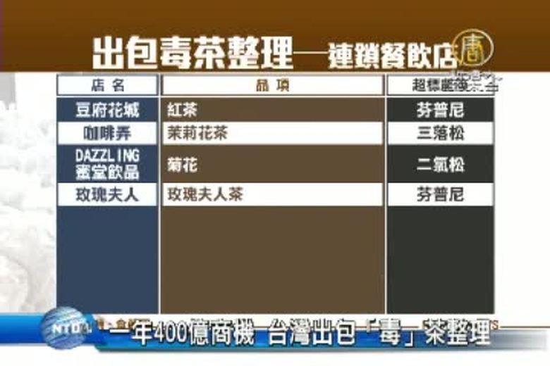 毒茶風暴一波未平一波又起,以新鮮果汁茶飲聞名的大苑子包種青茶茶包也驗出農藥!大苑子昨天(5日)主動通報,旗下的袋裝 及罐裝包種青茶,被驗出農藥超標,大苑子今天自行將問題產品下架,而這批茶葉是來自台南市的聖芳茶業公司,台南市衛生局說,早在前天就接獲檢舉該公司茶葉有問題,已經進行抽驗與封存。 //asset1.ntdtv.com.tw/public/uploads/assets/2015/05/06/2015-05-06-554a326ada742.mp4 毒茶|大苑子|聖芳茶業|茶飲|農藥2015-05-06 20:03:10