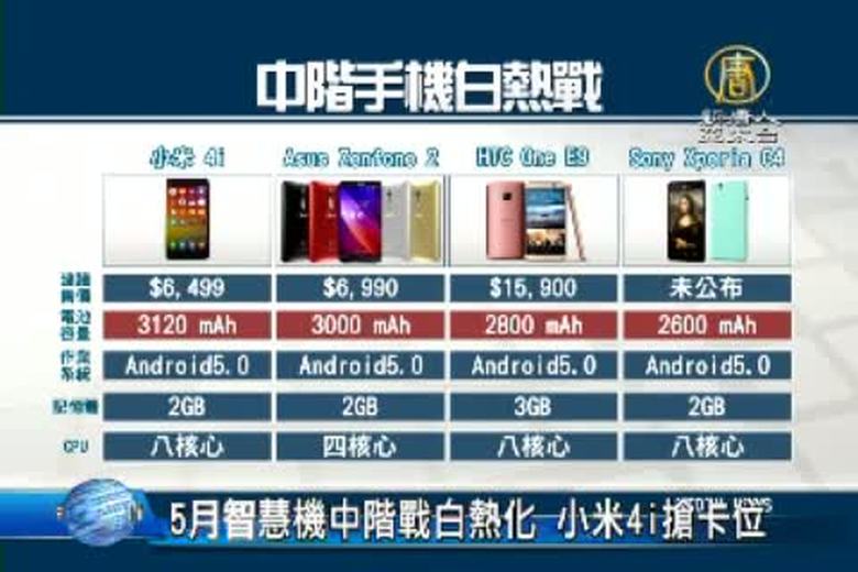 財經消費訊息來看到,高階智慧型手機戰場,在五月份暫時告一段落,但中階市場的號角才正要響起,5月份,包括宏達電E9+,Desire系列,持續的華碩ZenFone2,大陸小米公司,今天也在台宣布推出國際版中階機種「4i」,加入逐漸白熱化的中階手機戰場。 //asset1.ntdtv.com.tw/public/uploads/assets/2015/05/07/2015-05-07-554b7a1fedd9f.mp4 小米4i|手機|智慧型手機|中階手機|雷軍2015-05-07 20:16:17