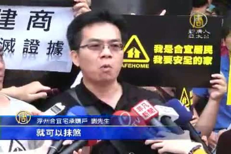 接著繼續看到,日勝生集團董事長林榮顯,昨天(8日)鞠躬道歉,表達願意無息退屋。今天上午,新北市政府工務局與住戶召開溝通會議,有五百位承購戶,現場抗議,質疑日勝生偷偷補強裂縫,是毀跡滅證。 //asset3.ntdtv.com.tw/public/uploads/assets/2015/05/09/2015-05-09-554e0abf137d0.mp4 浮洲合宜宅|浮洲合宜宅受災住戶自救會|日勝生|新北市|朱惕之2015-05-09 21:25:26