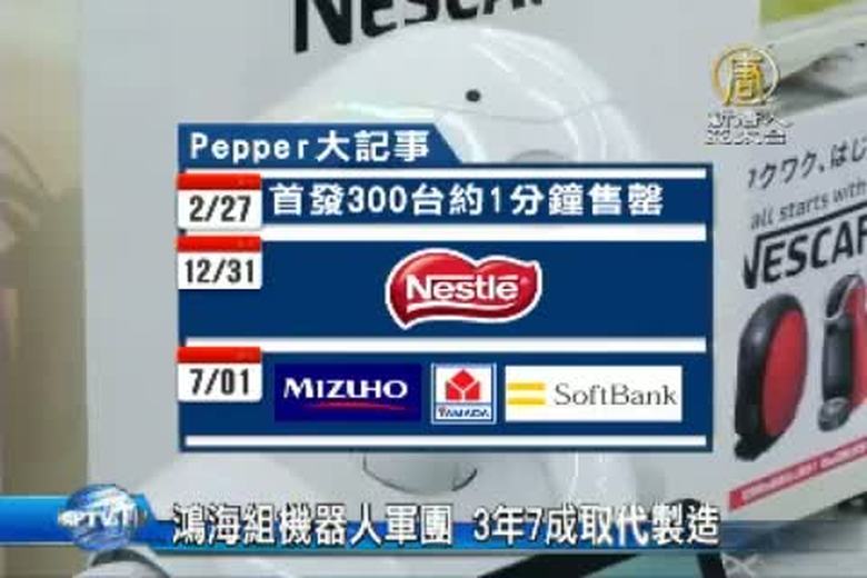 日本軟銀2月首發300台具有感情辨識功能的機器人Pepper,1分鐘銷售完畢,這款機器人由台灣鴻海代工製造,這也是鴻海集團總裁郭台銘,機器人產業布局的重要一環,郭台銘預言機器人工業將大過汽車工業,並規劃未來三年,鴻海有七成的製造比重,由自動化機器人取代。 //asset1.ntdtv.com.tw/public/uploads/assets/2015/05/09/2015-05-09-554e0013311a2.mp4 郭台銘|鴻海機器人|Pepper|小米|蘋果|日本軟銀2015-05-13 01:51:36