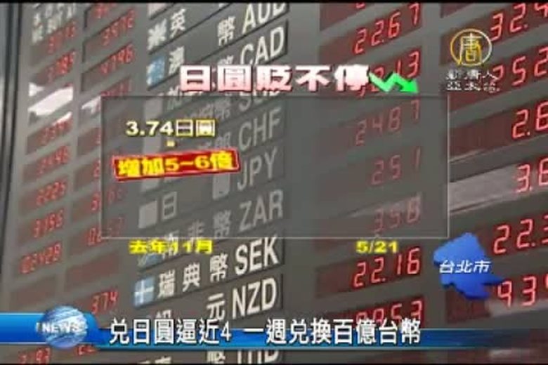 日圓已經貶到17年來新低點,新台幣1元可換3.9元多的日圓,距離4元只剩半步之遙,而最近日圓貶值,銀行櫃檯換日幣,一週就換掉100億台幣。 //asset2.ntdtv.com.tw/public/uploads/assets/2015/05/25/2015-05-25-55633191d94d0.mp4 旅展|日圓|旅遊|匯率|日元貶值2015-05-25 20:15:13