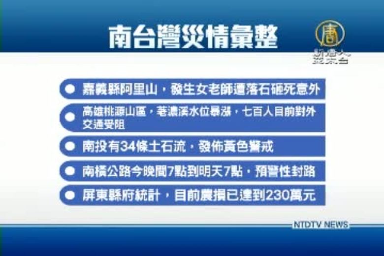 新聞頭條帶您看到,鋒面來襲,台灣連日大雨,南部多處傳出災情。嘉義縣阿里山,發生女老師遭落石砸死意外;高雄桃源山區,荖濃溪水位暴漲,七百人目前對外交通受阻;另外,南投有34條土石流,發佈黃色警戒;要提醒駕駛朋友注意的是,南橫公路今晚間7點到明天7點,預警性封路;至於在農損方面,屏東縣府統計,目前農損已達到 230萬元。 //asset3.ntdtv.com.tw/public/uploads/assets/2015/05/25/2015-05-25-556330a3a9485.mp4 梅雨鋒面|災情|氣象局|淹水2015-05-25 20:01:34