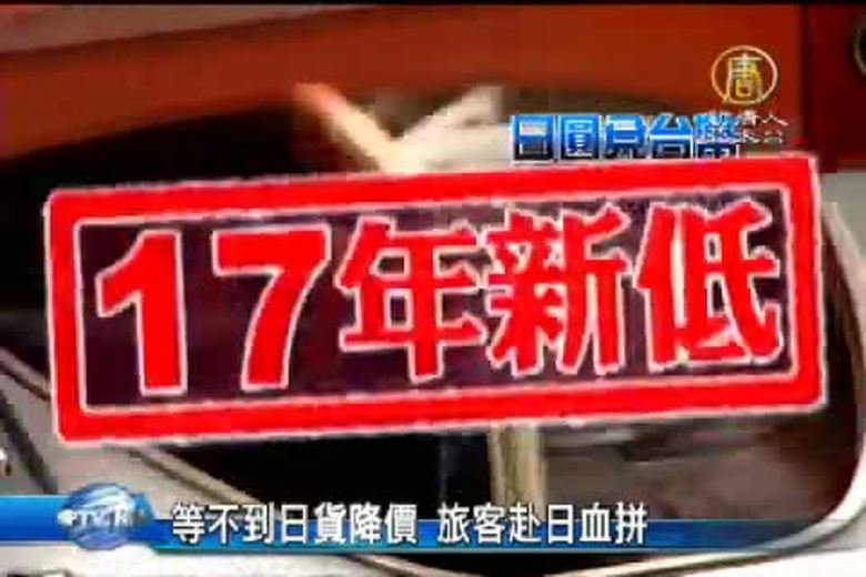 日圓狂貶,不僅兌美元匯率,貶到12年來最低,兌台幣價位,也創下17年來最低水準,每1元台幣可以換到4日圓,但日系商品卻沒有降價計畫,只有短期促銷優惠。 //asset3.ntdtv.com.tw/public/uploads/assets/2015/05/29/2015-05-29-55686807aa57f.mp4 日圓|日幣|台幣|匯率|旅遊2015-05-29 21:16:17