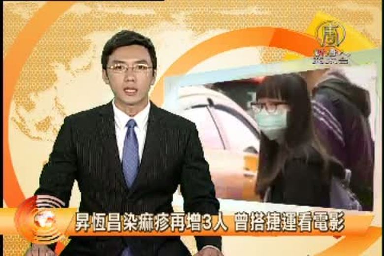 再來看到,也是引發關注的,昇恆昌免稅商店,群聚感染麻疹,再添3例。其中一名案例發病前,曾經搭捷運往返國父紀念館與七張站,甚至出入京站電影院與銀行。疾管署呼籲近期出入以上地點民眾,自主健康管理18天,一旦出現身體不適,應配戴口罩儘速就醫。 //asset1.ntdtv.com.tw/public/uploads/assets/2015/05/29/2015-05-29-556872ac81296.mp4 痲疹|昇恆昌|疾管署2015-05-29 20:48:15