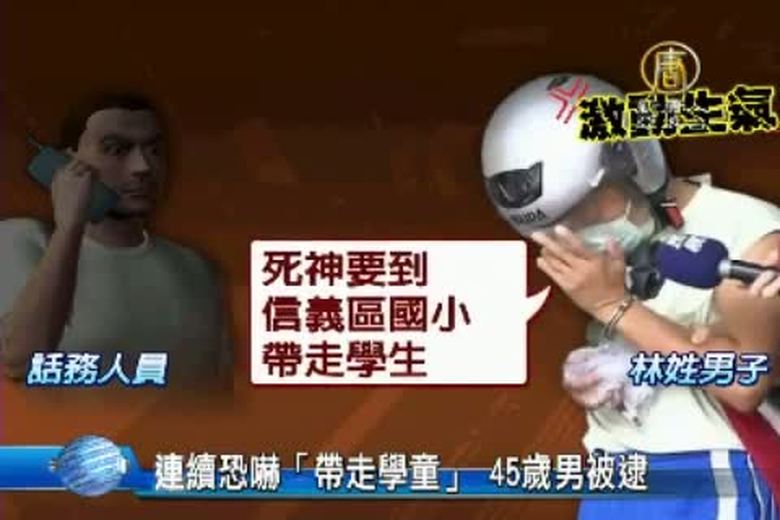 北投女童割喉案震驚社會,沒想到又有男子打電話到台北市1999專線,連續恐嚇2次,說「將有死神要去信義區小學帶走學童」!警方透過通聯紀錄,逮到45歲的林姓男子。誇張的是,他在同一天之內,也打進新北市市民專線,揚言要擄童。被問到為什麼這麼做?男子卻完全不肯說。 //asset3.ntdtv.com.tw/public/uploads/assets/2015/06/07/2015-06-07-557440b229c7e.mp4 割喉案|1999專線|恐嚇|擄童|校園安全|市民專線2015-06-07 20:57:08