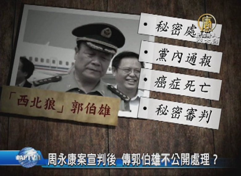 周永康案秘密審判之後,6月14號,現在海外媒體也放消息說,前軍委副主席郭伯雄的貪腐案,因為癌症,也不公開處理了。至於「不公開」的程度,還是有一些區別的,可能是秘密處理、黨內通報、癌症死亡和秘密審判,究竟屬於哪一種,恐怕還需要時間來證明了。 //asset3.ntdtv.com.tw/public/uploads/assets/2015/06/15/2015-06-15-557edf922c5df.mp4 周永康|郭伯雄|秘密審判|習近平2015-06-15 20:24:54