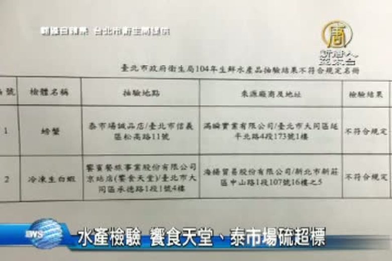 北市衛生局抽驗,市售生鮮產品共55件,發現「饗食天堂」京站店的冷凍白蝦,以及「泰市場」誠品店的螃蟹,二氧化硫都超標,不符規定。 //asset1.ntdtv.com.tw/public/uploads/assets/2015/06/15/2015-06-15-557ec9c2da430.mp4 食安|抽驗水產|泰市場|饗食天堂|二氧化硫2015-06-15 20:46:07