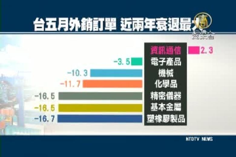 財經消息,經濟部今天公布五月外銷訂單,為357.9億美元,年減高達5.9%,是22個月以來最大衰退。從數據圖來看,除了,資訊通信產品,仍然是較同期增加,其他,電子、機械、化學、精密儀器、金屬、塑橡膠 等,都是二位數負成長;以接單地區分析,只有來自美國的接單為正成長,其它對日本、中國訂單則分別衰退達23.8%及11.6,除了受日圓貶值效應影響,中國紅色供應鏈也是原因之一。 //asset2.ntdtv.com.tw/public/uploads/assets/2015/06/23/2015-06-23-5589689f8014c.mp4 外銷|中口訂單2015-06-23 22:51:56