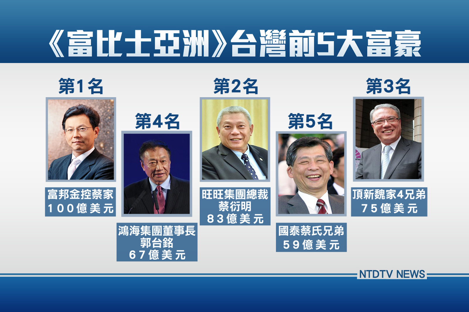《富比士亞洲》昨天公布最新的台灣前50大富豪排行榜。 富邦金控蔡家以100億美元資產,擊敗去年首富、旺旺集團總裁蔡衍明,首度躍上台灣首富。報導指出,受到中國內需減緩、影響台灣產業出口,台灣富豪的身家大縮水,蔡衍明的資產縮水13億美元,下降到第2名,頂新魏家兄弟的資產也減少11億美元,排名第3。鴻海集團董事長郭台銘位居第4,第5名則是國泰的蔡氏兄弟 。 //asset3.ntdtv.com.tw/public/uploads/assets/2015/06/25/2015-06-25-558c12ea2b60e.mp4 富比士|富豪|蔡衍明|魏應充|郭台銘2015-06-25 20:08:17