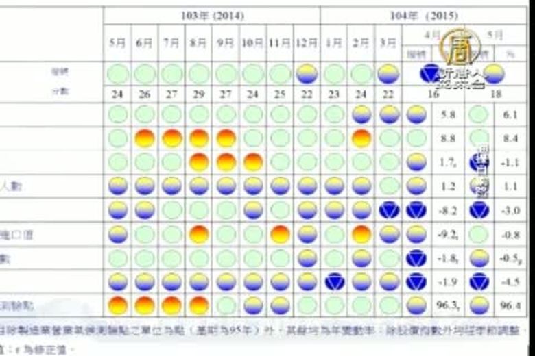 國發會今天公布5月景氣燈號,從憂鬱藍燈轉到黃藍燈,國發會表示,整體而言,國內經濟因出口、生產與銷售不佳,短期內成長動能篇弱,但下半年可望逐漸改善。 //asset3.ntdtv.com.tw/public/uploads/assets/2015/06/26/2015-06-26-558d5708f041e.mp4 景氣燈號|國發會|景氣2015-06-26 20:19:55