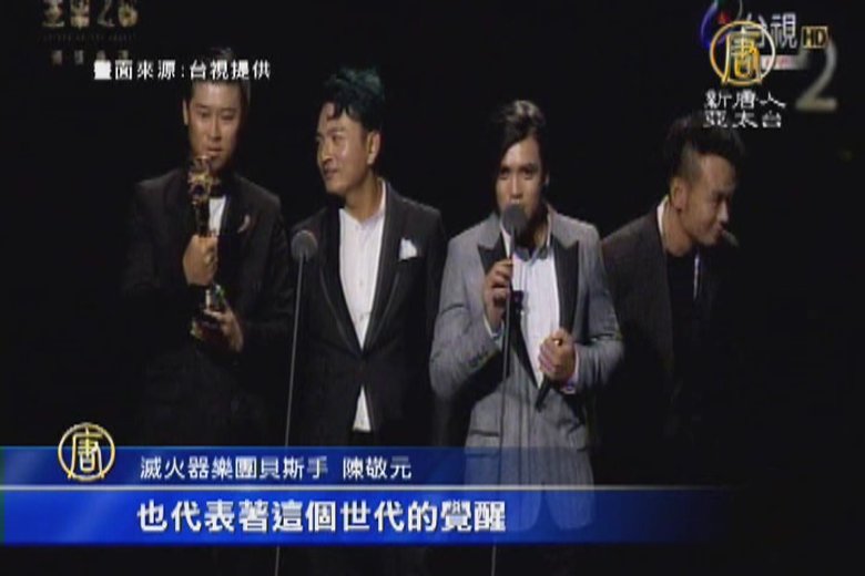 第26屆金曲獎最佳年度歌曲,由滅火器的《島嶼天光》打敗蔡依林、張學友等人,一舉拿下。但中國大陸的金曲直播平台,時間比台灣延遲了十幾分鍾,到了頒發年度歌曲時,滅火器的得獎片段,整段直接被卡掉,跳過沒有播出,就連得獎名單也獨漏《島嶼天光》。 //asset1.ntdtv.com.tw/public/uploads/assets/2015/06/28/2015-06-28-55900b6229836.mp4 第26屆金曲獎|滅火器|島嶼天光|最佳年度歌曲|楊大正2015-06-29 10:59:25