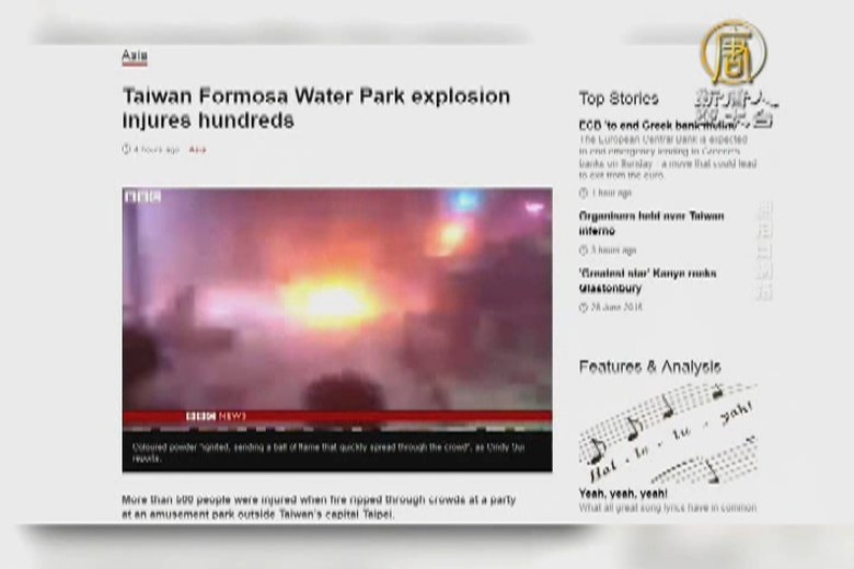 新聞頭條帶您看到,台灣新北市八里區八仙樂園,昨日晚間發生「彩色趴」粉塵爆炸,造成519人受傷,其中2百多人屬於重傷,今天包括總統馬英九與雙北市長都出面回應檢討,警方不排除是人為釀災,而行政院也已經下令,全台暫時禁止彩色粉末公共活動。 //asset3.ntdtv.com.tw/public/uploads/assets/2015/06/28/2015-06-28-55900c80173f0.mp4 八仙樂園|粉塵|爆炸|瑞博國際|彩色派對|玉米粉2015-06-29 16:52:27