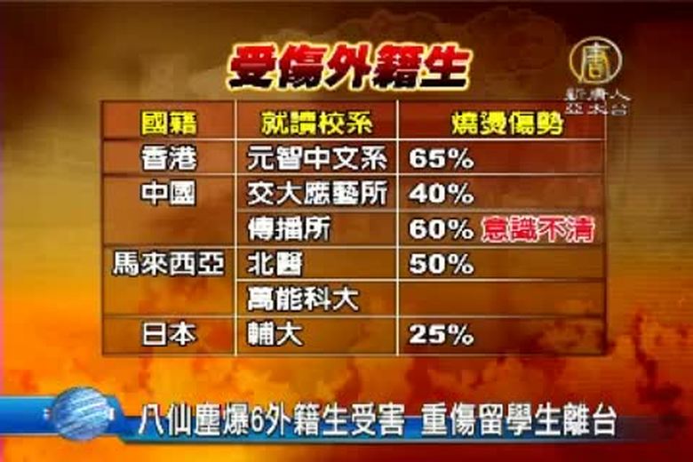 新北市八仙樂園粉塵爆炸意外,受傷者很多都是在學生,其中包括69位高中職,151位大學生,其中,還有6位外籍學生,有的父母親,已經趕來台灣。其中3名僑生,也在下午,搭乘醫療專機,陸續離台。 //asset3.ntdtv.com.tw/public/uploads/assets/2015/06/29/2015-06-29-55913f832d102.mp4 粉塵爆炸|八仙|八仙樂園|外籍生|香港|教育部2015-06-29 22:13:13