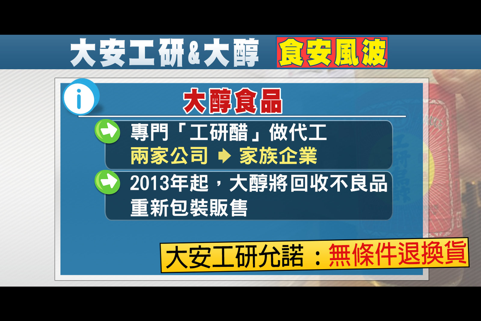 另外一個焦點話題,老字號的大安工研,旗下代工廠大醇食品,涉嫌將過期品混充,重新販售,歷經多天的爭議,今天,大安工研終於召開記者會,公開道歉,並強調,包括烏醋等11項有疑慮產品,無條件接受消費者退款或換貨。 //asset3.ntdtv.com.tw/public/uploads/assets/2015/09/15/2015-09-15-55f6cc8234741.mp4 食安|大安工研|烏醋|大醇食品|道歉|食安風暴2015-09-14 20:09:22