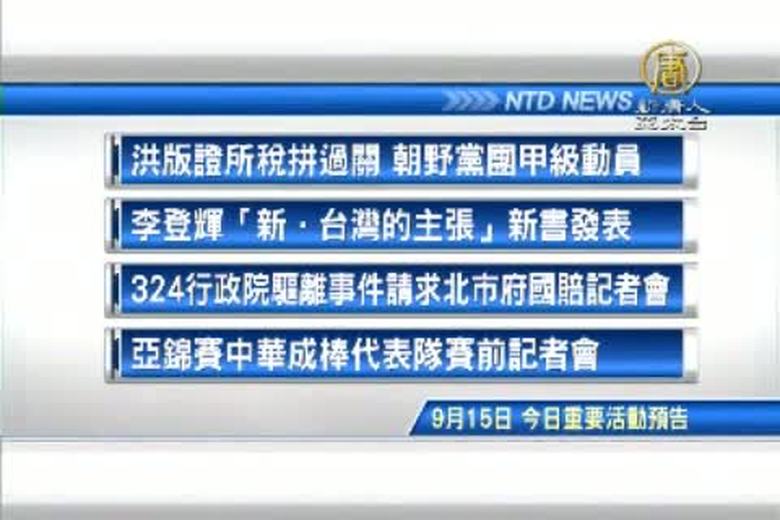 新聞頭條帶您看到,今天是(15日)立法院會期第一天,朝野黨團進行議事表決攻防。國民黨團以人數優勢,護航自經區條例逕付二讀,並否決台聯「廣電三法」議程變更。就在朝野表決大戰時,國民黨立委張慶忠突然在會議桌上下跪,要求儘速審議兩岸監督條例。 //asset1.ntdtv.com.tw/public/uploads/assets/2015/09/16/2015-09-16-55f8287022b99.mp4 張慶忠|半分鐘|下跪|自經區|兩岸監督條例2015-09-15 20:03:14