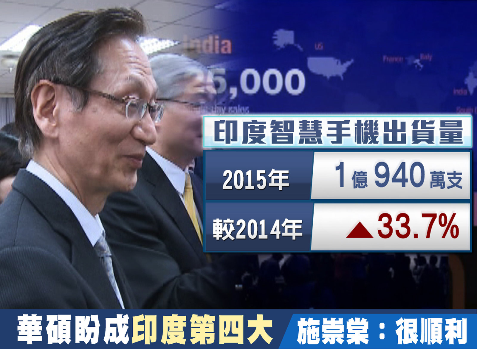 華碩進軍印度市場傳出銷售捷報,更期望能搶下5%市占率,成為印度第四大科技廠,今天董事長施崇棠出席臺大圖書館捐贈活動時,被問到,布局印度的進度時,施崇棠簡單回答,很順利。 //asset1.ntdtv.com.tw/public/uploads/assets/2015/09/19/2015-09-19-55fc19930fd8c.mp4 華碩|施崇棠|印度|聯想|智慧手機|楊泮池2015-09-18 21:28:35