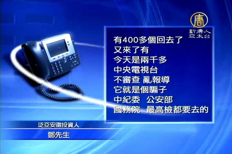 中國昆明「泛亞有色金屬交易所」因資金鍊斷裂不能兌付,兩個月來引發多次大規模維權,星期一,來自全國各地的投資人集體進京,去信訪局和證監會上訪。昨天,兩千多位投資人直接到中央電視台,抗議央視的報導,欺騙社會大眾。 //asset3.ntdtv.com.tw/public/uploads/assets/2015/09/23/2015-09-23-56029bdc13041.mp4 泛亞|交易|央視2015-09-23 20:30:25