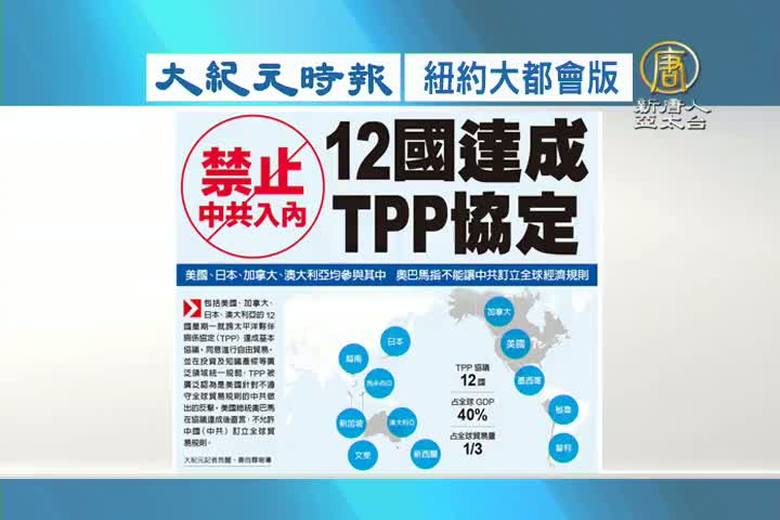再來看到,泛太平洋12個國家達成自由貿易協議(TPP),將全球40%的經濟量捆在一起,中國因為無法按TPP規則行使,沒有加入。經濟學家指出,中國唯有盡快進行政治體制改革,才是出路。 //asset2.ntdtv.com.tw/public/uploads/assets/2015/10/07/2015-10-07-56150f299fb7d.mp4 TPP|自由貿易協議|TTIP|EPA|中國|政治體制2015-10-07 20:22:46