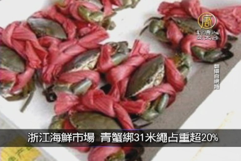 金秋時節,「五花大綁」的青蟹滿街可見,在中國浙江滿街可見。一隻從「三門‧中國青蟹城」買來的青蟹,價格為72.60元,重量為0.66kg,繩子顯示重量為0.14kg,占比重超過20%,捆綁青蟹的專用商標帶,竟然長達31米。 //asset1.ntdtv.com.tw/public/uploads/assets/2015/10/10/2015-10-10-561905399b1ec.mp4 2015-10-10 20:28:38
